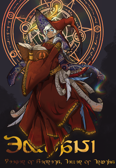 They are commonly seen in dark red robes with a wide brimmed pointy hat resembling a bird. Some believe his sense of fashion is what inspired the common look for mages and scholars. Golden runes line the hems and seams of her robes, and they are almost never seen without a book containing his divine symbol that contains a corpus of all her knowledge. They also have a mechanical monocle to help him read small print.